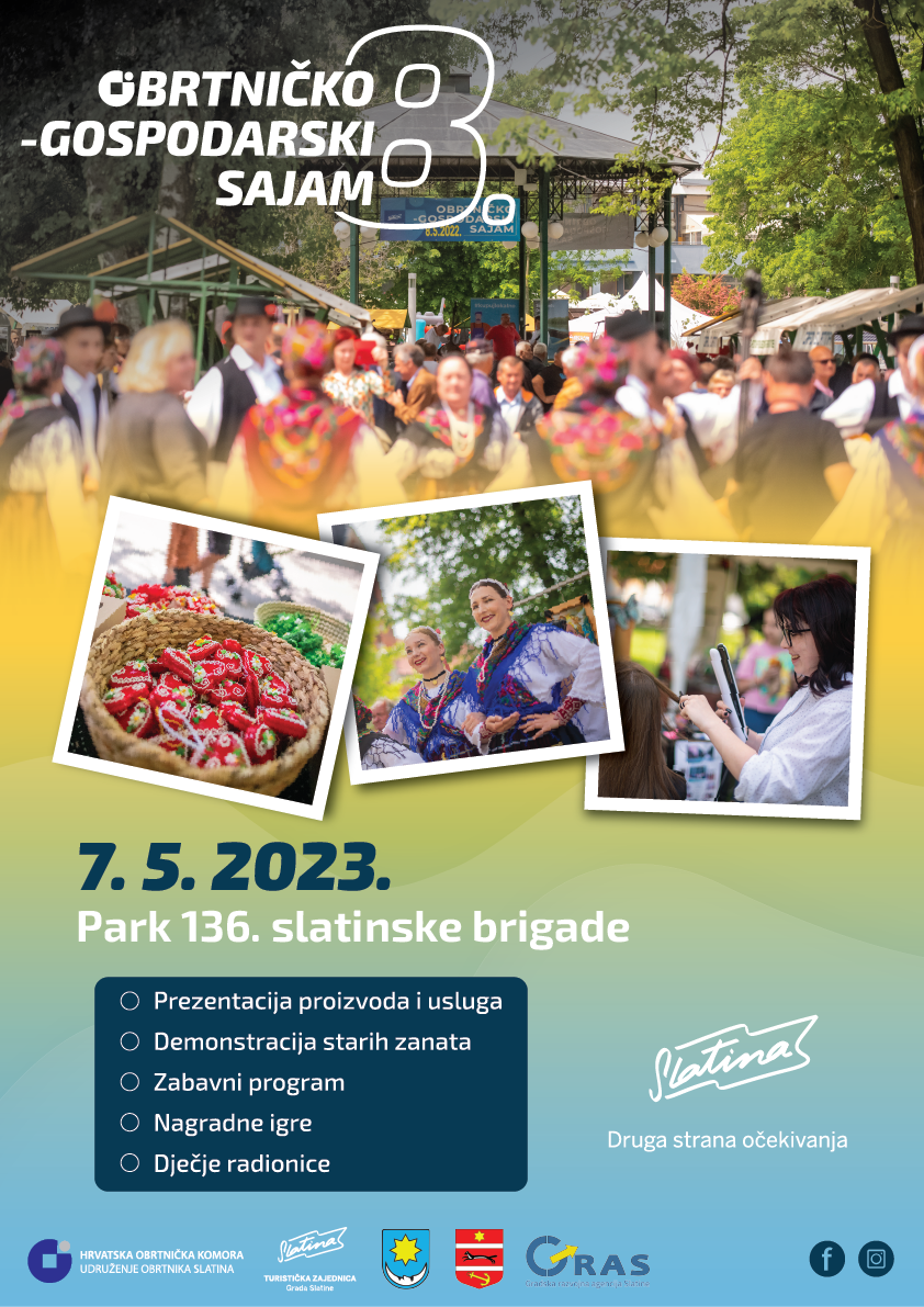 Hrvatska obrtnička komora – Udruženje obrtnika Slatina, Turistička zajednica Grada Slatine, Grad Slatina i Gradska razvojna agencija Slatine pozivaju vas na 8. obrtničko-gospodarski sajam koji će se održati u nedjelju, 7. svibnja, u Parku 136. slatinske brigade.