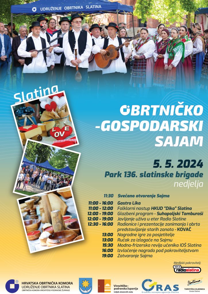 Udruženje obrtnika Slatina uz pokroviteljstvo Grad Slatine, Turističke zajednice grada Slatine, Gradske razvojne agencije Slatine, Virovitičko-podravske županije te HOK – Područne obrtničke komore Virovitičko-podravske županije poziva vas na 9. Obrtničko-gospodarski sajam koji će se održati u nedjelju, 5. svibnja, u Parku 136. slatinske brigade.