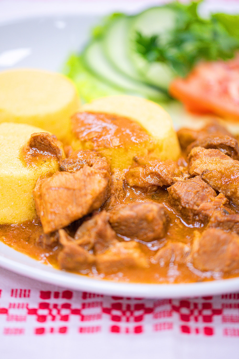 Meso narežite na kocke veličine zalogaja. Slaninu narežite na sitne kockice. Na malo ulja ili masti pržite sitno nasjeckani luk dok ne postane staklast i mekan. Dodajte nasjeckanu slaninu i pržite dok ne pusti mast i postane hrskava. Pojačajte vatru, dodajte kocke mesa i zapecite ih sa svih strana dok ne dobiju boju. Dodajte protisnuti češnjak, nasjeckanu mrkvu i začine (sol, papar, lovorov list). Kada meso dobije boju, podlijte crnim vinom i pustite da alkohol ispari, a tekućina se reducira. Dodajte mljevenu papriku i sok od rajčice, promiješajte, podlijte vodom ili temeljcem da prekrije meso. Smanjite vatru, poklopite i kuhajte (dinstajte) na laganoj vatri dok meso ne omekša (može potrajati 2 do 4 sata, ovisno o vrsti mesa). Po potrebi dolijevajte malo tekućine. Oko 30 minuta prije kraja kuhanja dodajte gljive narezane na ploške i kuhajte dok gulaš ne dobije gustu teksturu, a gljive omekšaju.