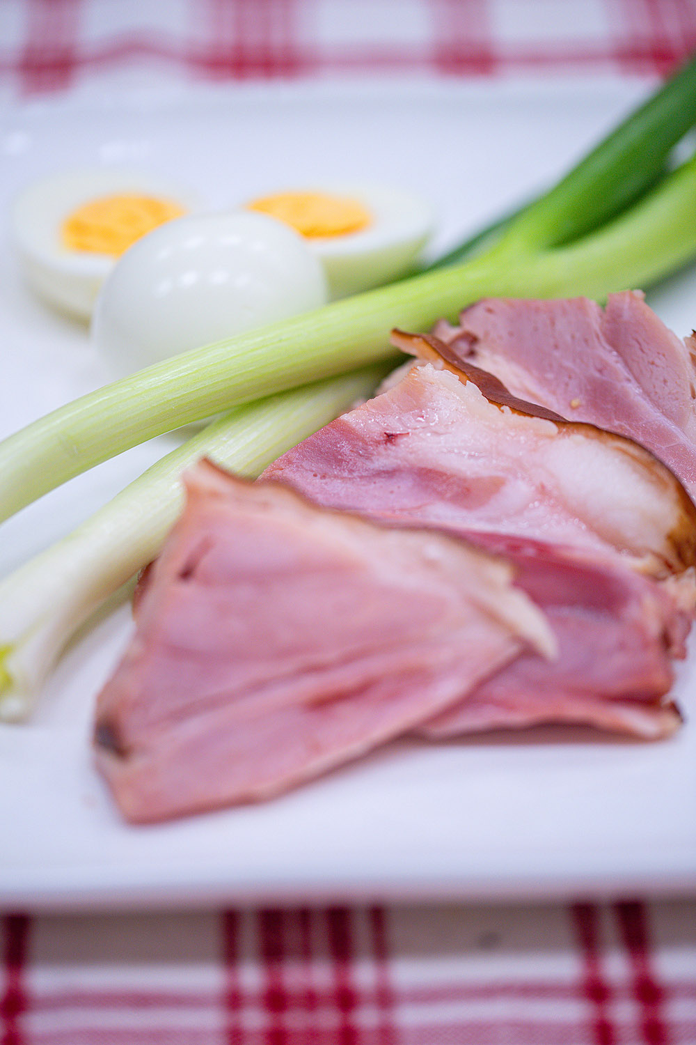 Sastojci: šunka (u komadu ili narezana), jaja, mladi luk, sol, papar