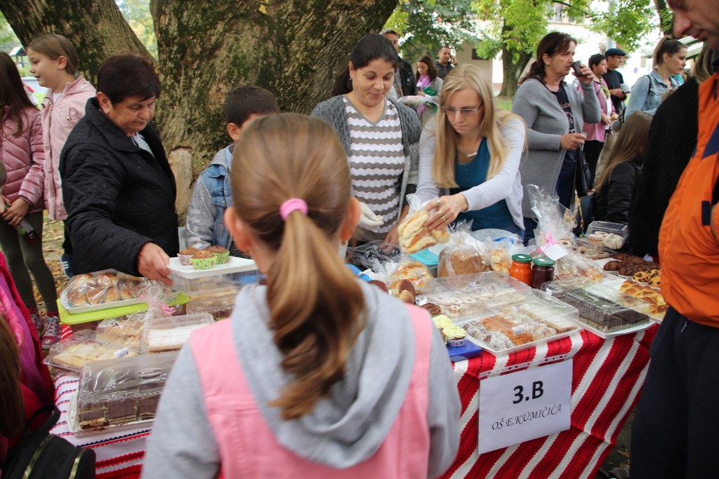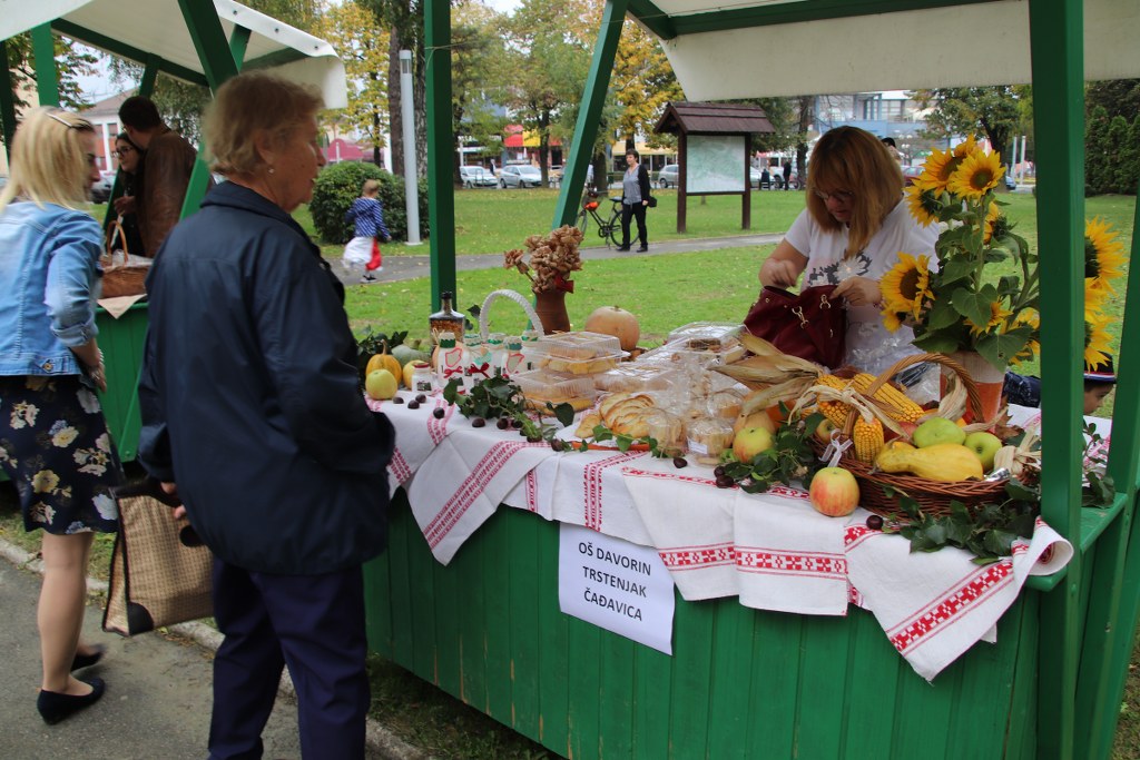 Uređenost štandova bila je i više nego na visini, zahvaljujući trudu djece, njihovih nastavnika te naravno roditelja bez čije podrške bi bilo i nemoguće organizirati ovakav događaj. Našlo se tu svo obilje koje donosi jesen, od tikvi, krušaka, jabuka, dunja, kukuruza, lješnjaka, oraha, kestenja, grožđa, vrganja, češera… zatim predmeta kojima se čuvaju narodni običaji, kao što su ćupovi, bačvice, pletene košare, ručni radovi od komušine, vjenčići od suhog cvijeća, vezeni ukrasi, ali prije svega pregršt miomirisnih kolača i pekarskih proizvoda, kiflica, pereca, vafli, makovnjača, pita… pekle su se i palačinke, a u parku se našla i kućica od kolača iz bajke o Ivici i Marici.