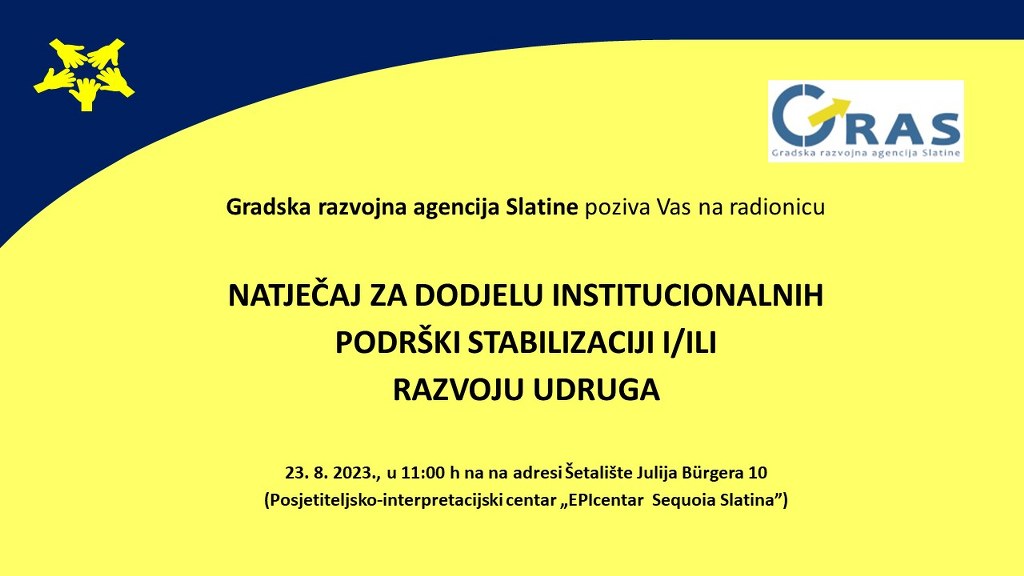 Gradska razvojna agencija Slatine poziva Vas na besplatnu informativnu radionicu pod nazivom „Natječaj za dodjelu institucionalnih podrški stabilizaciji i/ili razvoju udruga“, u okviru koje će svim zainteresiranim udrugama biti predstavljene osnovne informacije te mogućnosti prijave na natječaj.
