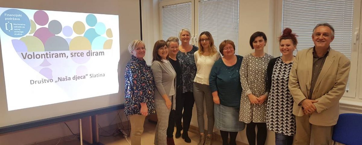 Projekt, čiji idejni začetnik je Jasenka Plantak iz Udruge mladih „KRIK“, predstavila je njegova koordinatorica Julijana Pavlešić. Projekt će sadržavati niz aktivnosti: osnivanje 3 volonterska kluba i edukaciju 45 učenika u školama partnerima, edukaciju voditelja volonterskih klubova, radionice „upcyclinga“, organiziranje volontera za vršnjačku pomoć, organiziranje volontera za volontiranje u domu za starije i nemoćne, organiziranje volonterskih akcija prema idejama učenika, uključivanje šire zajednice u akciju „Hrvatska volontira“, izložbu radova, izradu monografije „65 godina volontiranja u Društvu Naša djeca Slatina“….