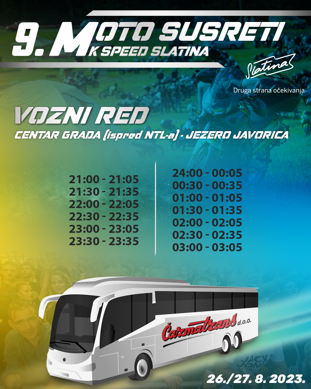 Vaša sigurnost i udobnost su nam prioritet, stoga su Turistička zajednica Grada Slatine i poduzeće Čazmatrans d.o.o. već treću godinu za redom osigurali besplatnu autobusnu liniju koja će prevoziti zainteresirane posjetitelje. Ne brinite oko parkinga i vožnje i sigurno dođite na odredište ugodnim prijevozom od Centra grada (ispred NTL-a) do jezera Javorice. Autobus će voziti prema voznom redu iz vizuala u nastavku te će pristajati i kod ulaza u ulicu Lipa (kod “Motela”). Još jednom se zahvaljujemo poduzeću Čazmatrans d.o.o. i rukovoditelju Slavenu Ercegu na nesebičnoj podršci te prepoznavanju ključnih turističkih aktivnosti na destinaciji.