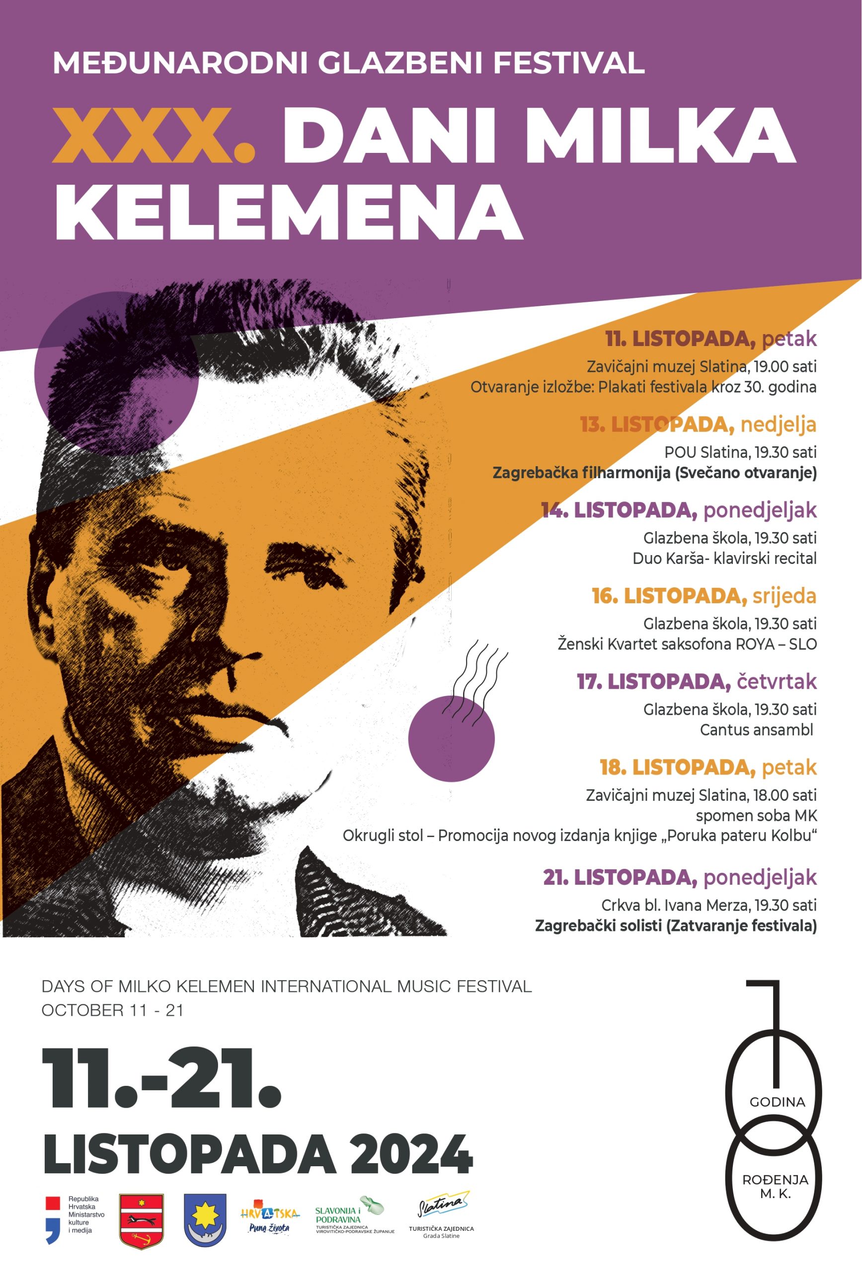 Grad Slatina i Festivalski odbor DMK imaju čast pozvati Vas na Međunarodni glazbeni festival Dani Milka Kelemena koji će se održati u Slatini od 11. listopada do 21. listopada 2024. godine.